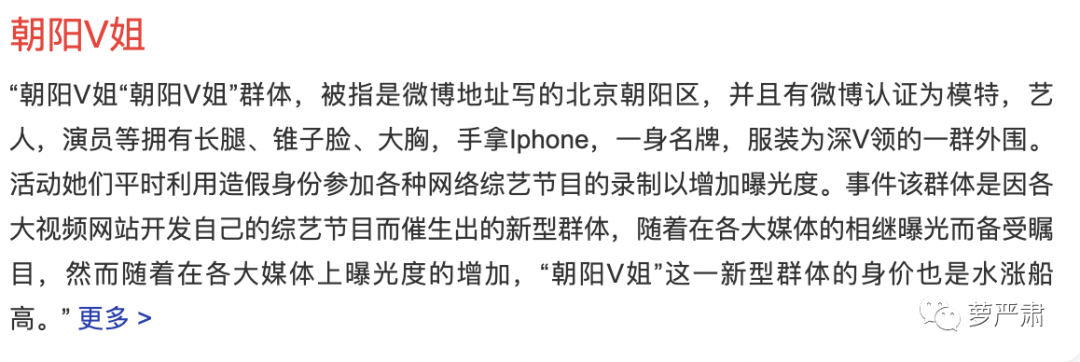 一个已经显得有些时代感的词汇是“朝阳V姐”,指的是微博上加了认证,脸型也是V脸,游走在朝阳区,整天社交因而引发联想的女网红。