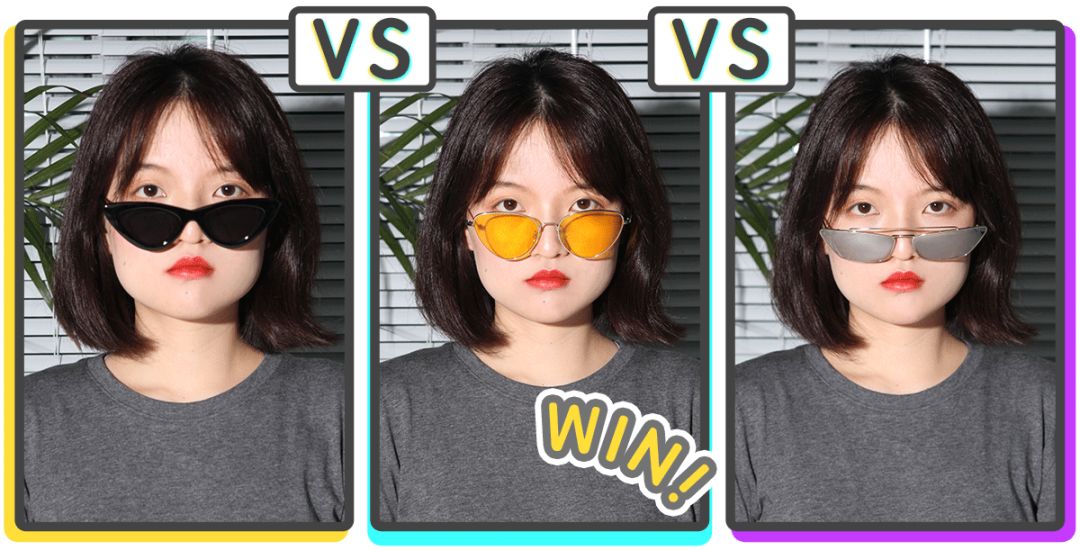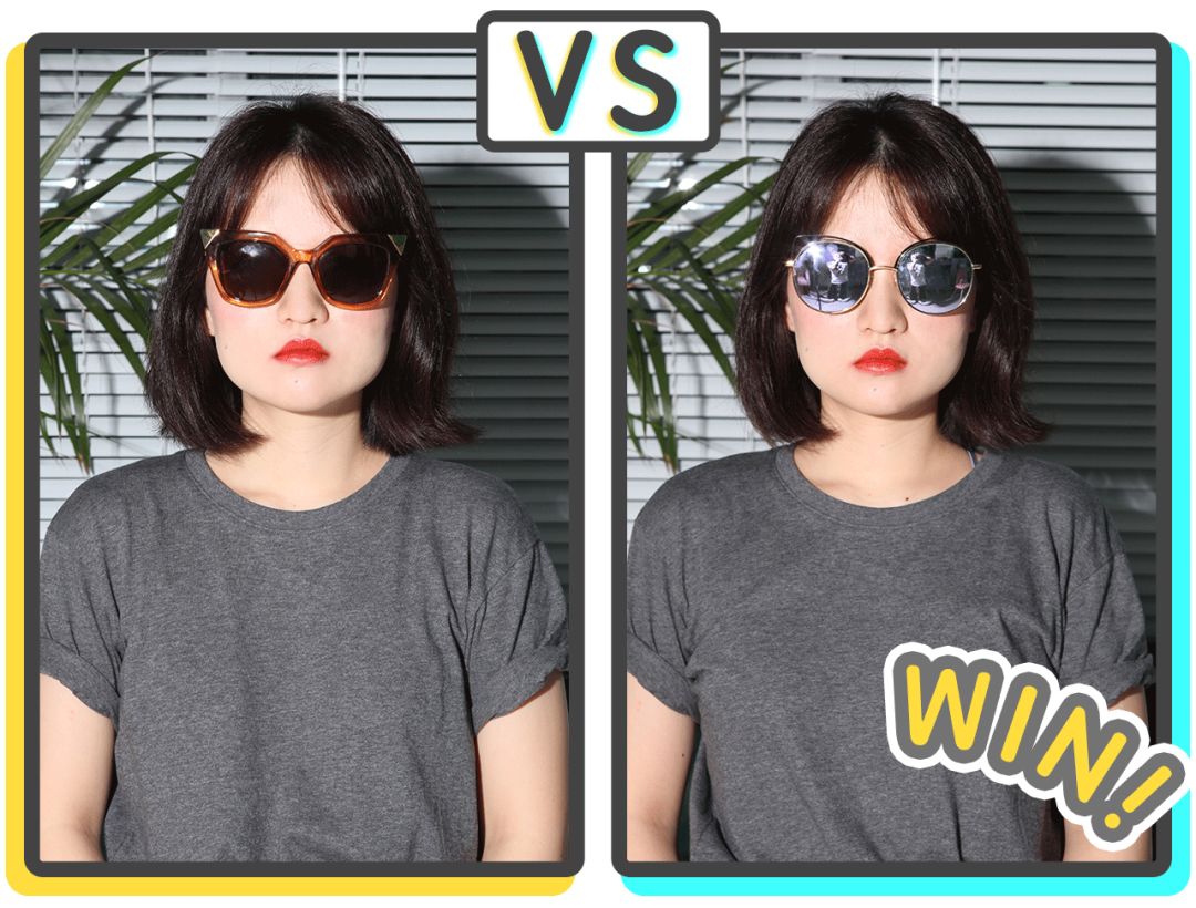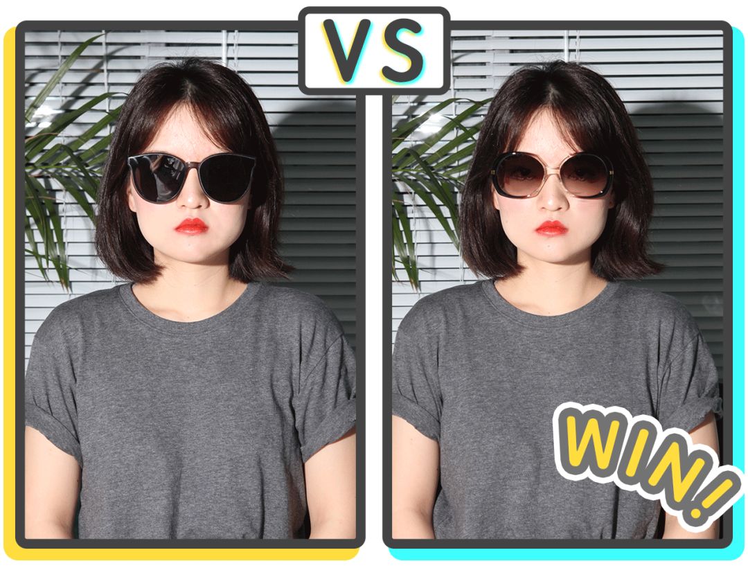 这两幅墨镜也产生了神奇的对比效果,左边这副黑框黑镜片,镜片下缘曲线比较圆,但镜片上缘有个向外的延伸,让墨镜宽度稍稍大于脸的宽度,产生了视觉上显瘦的效果。右边的这副墨镜则整体线条偏圆润,戴上后显得圆脸更圆了。👇