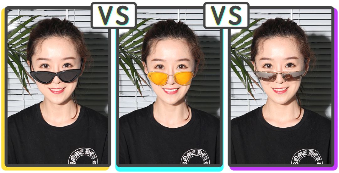 这两副方框墨镜的镜片高度是相差不多的,这种情况下,一副颜色深,遮挡作用强。另一副颜色浅,遮挡作用弱。那么遮挡作用强的深色墨镜就更能起到缩短脸部的效果。👇
