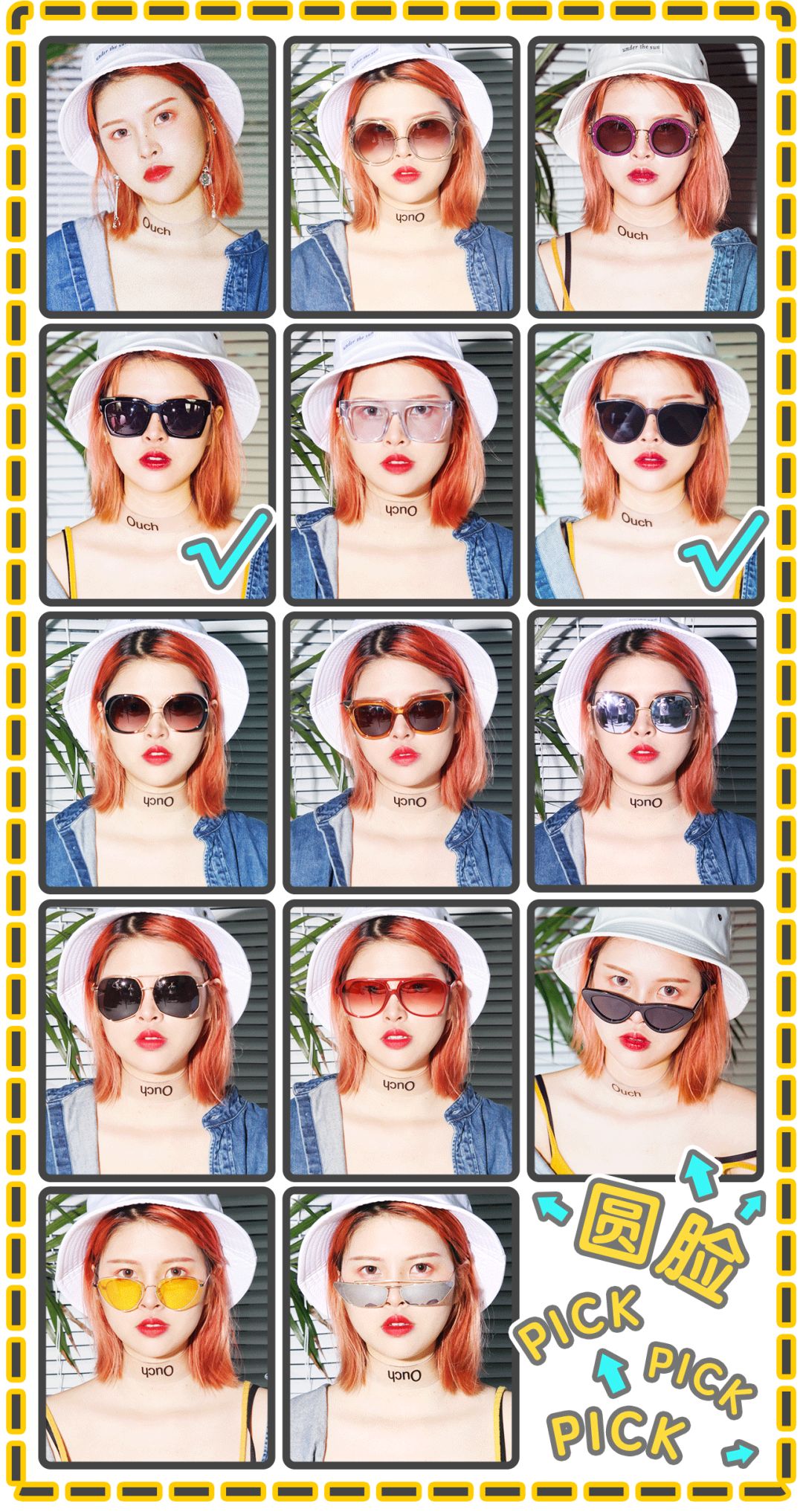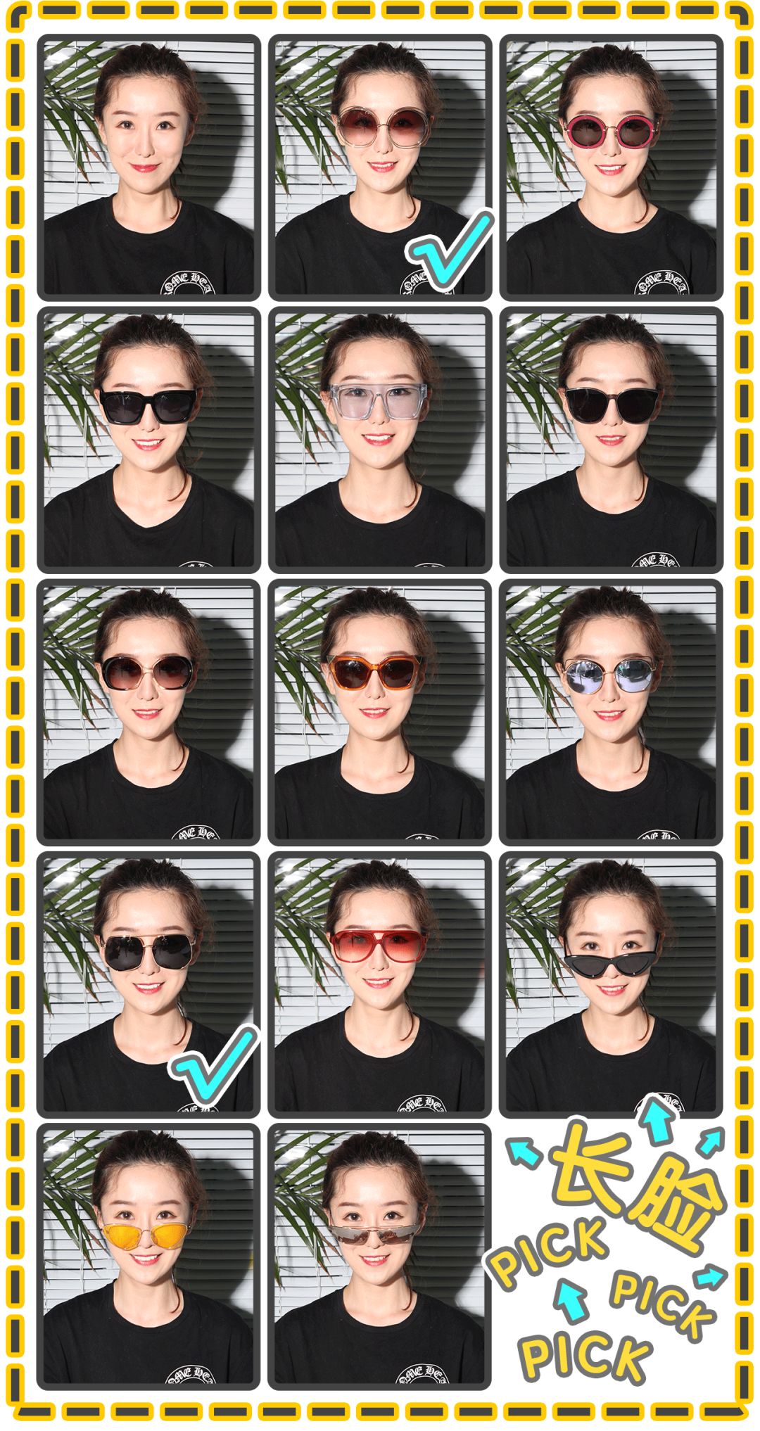 看了这么多副墨镜,你们肯定已经眼花了吧,让我们把所有墨镜放一块,一起对比看看圆脸到底适合什么样的墨镜,并且打勾标出来。👇