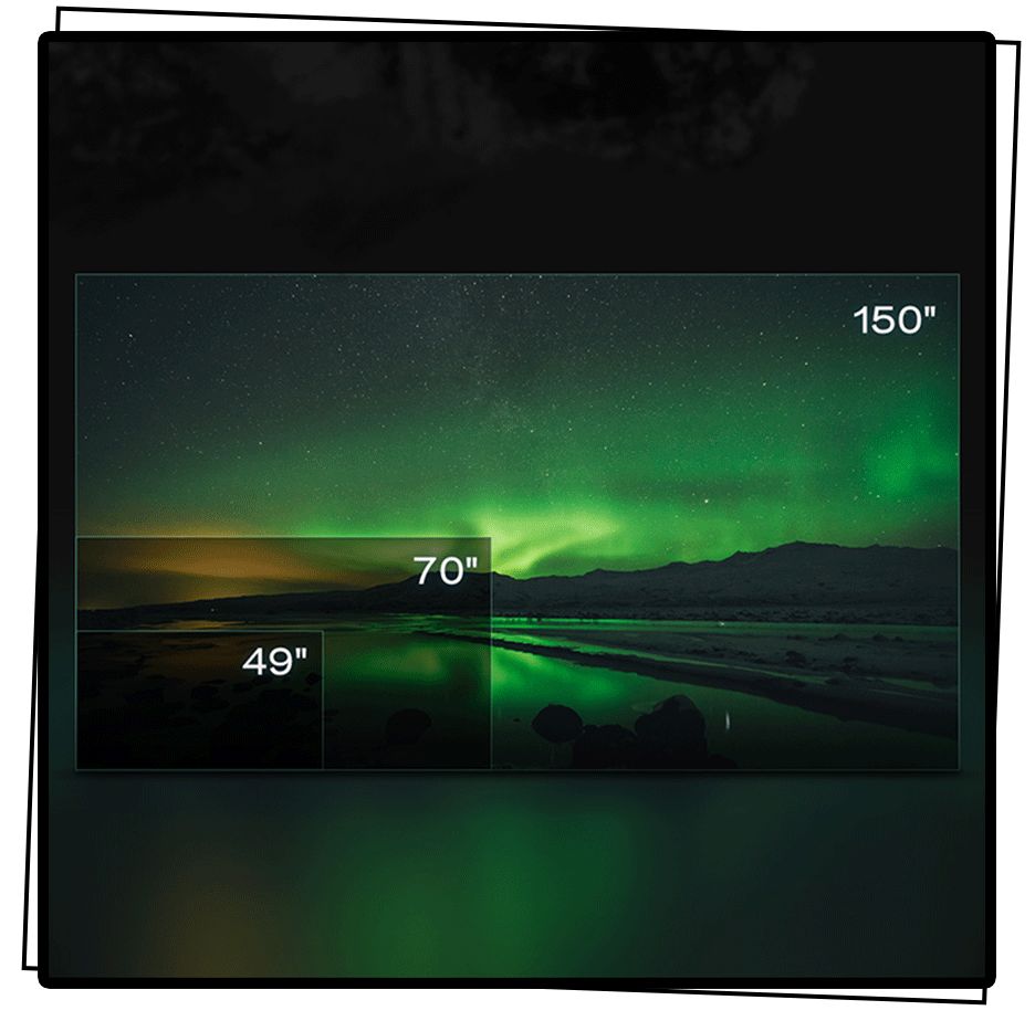 可以根据家里的墙面大小来调节画面尺寸,最大可以投放150英寸(其实我也不知道150英寸有多牛,总之直男朋友们都说150英寸挺厉害的…)👇