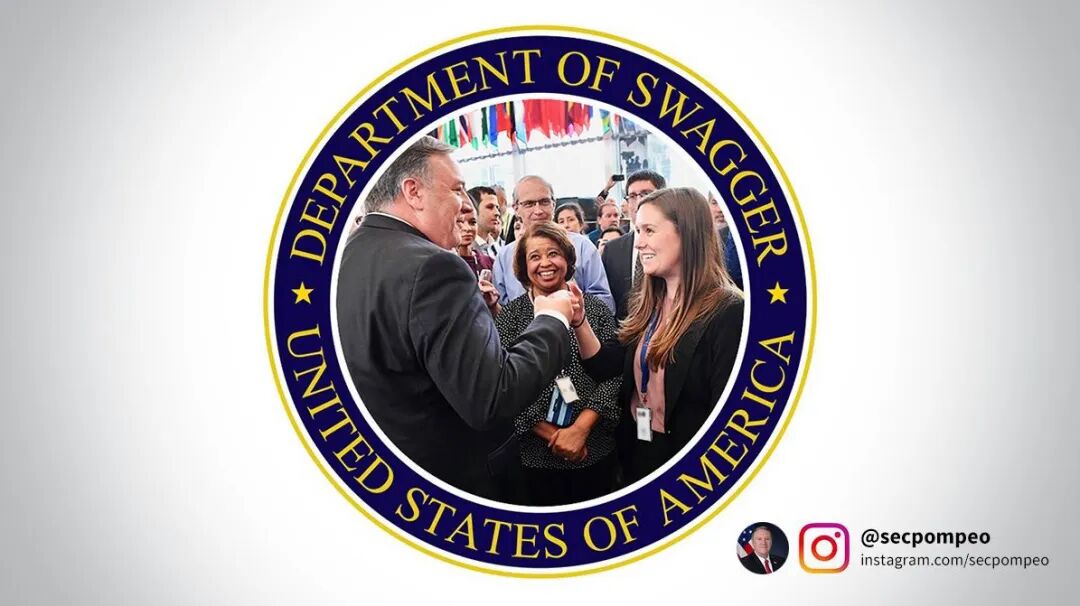 媒体报道过一个细节,在入职国务院的当天,蓬佩奥援引二战中巴顿将军的话说:“美国将重拾狂妄自大的姿态(swagger)。”他在社交媒体上发起了一场运动,号召美国人将他的照片和巴顿将军的照片放在一起,并且发布了一个带有新格言“招摇过市部(Department of Swagger)”的国务院(Department of State)标志。