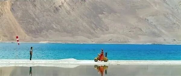 这次冲突地点在加勒万河谷地区,之前双方对峙的地点是与加勒万河相邻的班公湖,其实很多人都见过班公湖,就是《三傻大闹宝莱坞》最后那个场景的取景地。图中男女主人公身后的就是班公湖。