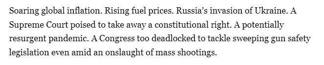 除了大规模枪击事件频发,还有通胀高启,油价飙升,俄乌战争,最高院几乎确定了将推翻堕胎权,以及随时又要来一波高潮的新冠疫情。