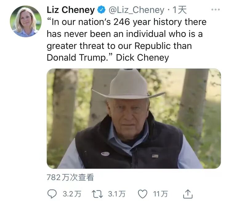 。即使利兹·切尼在自己的推特上,把老爸老切尼搬出来给自己站台,大骂懂王是“美国历史上的最大威胁”,是“懦夫”,也效果寥寥。