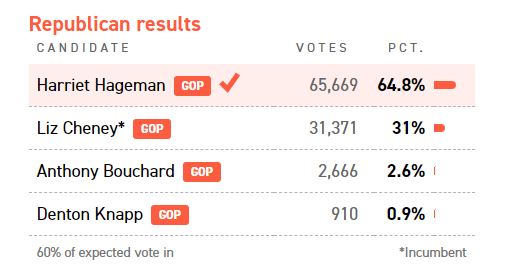 就在刚才,怀俄明州的初选结果出炉,才开了预计总票数的60%,利兹·切尼就确定败选了。得票的差距如之前预期,甚至可能比预期的更大。