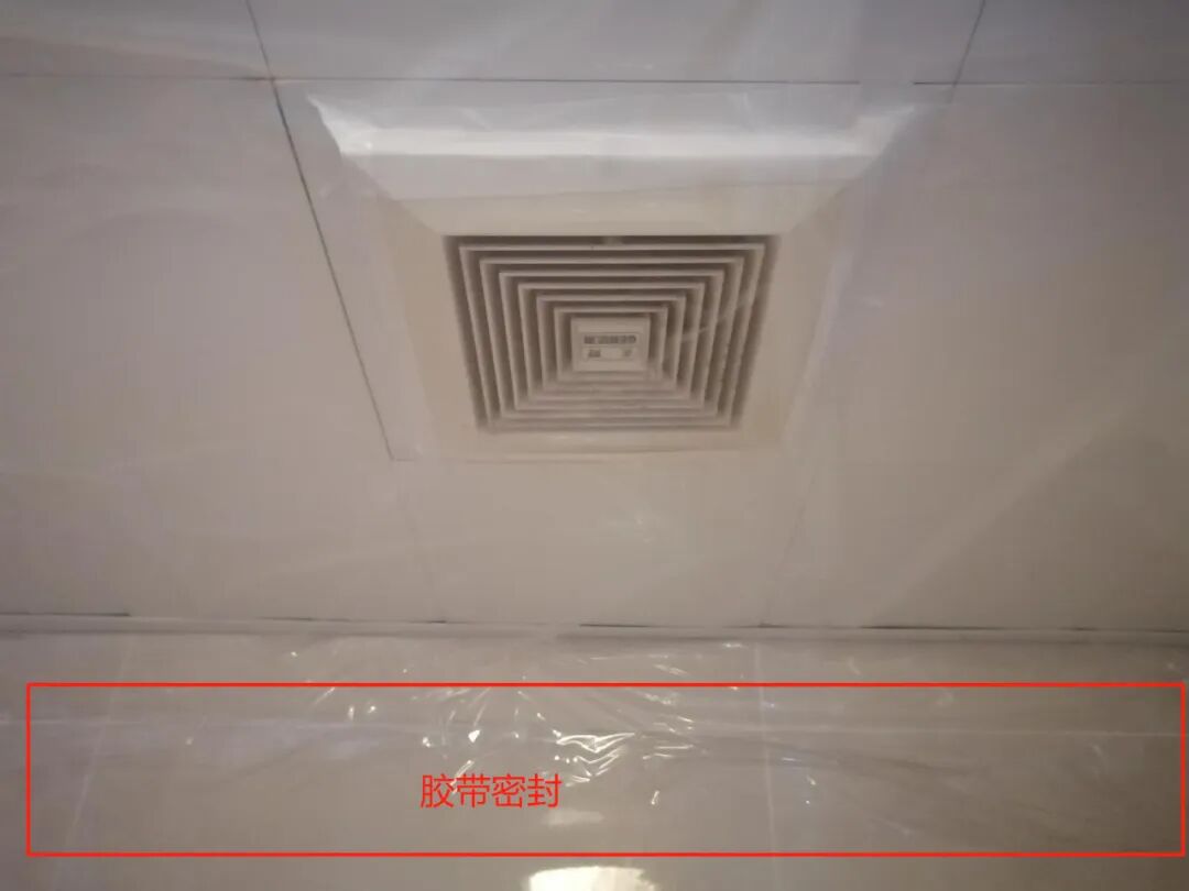 1.5 我们家洗手间上方有一个隔层,走楼上邻居家的水管,以及连接排风扇的风口,我们的处理方法比较粗暴,直接用一块塑料薄膜把顶封了,用胶带密封,定期检查。