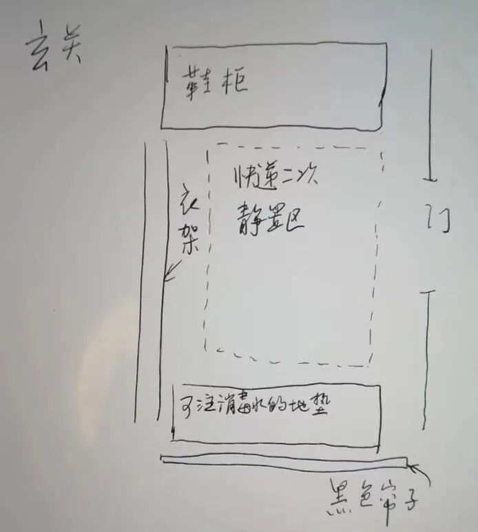 5.3 玄关处做了一个帘子,用来区分污染区和非污染区。污染区主要用来挂外衣外裤,放鞋子,以及静置快递,用黑色帘子是因为污染区会定时用紫外线消毒。