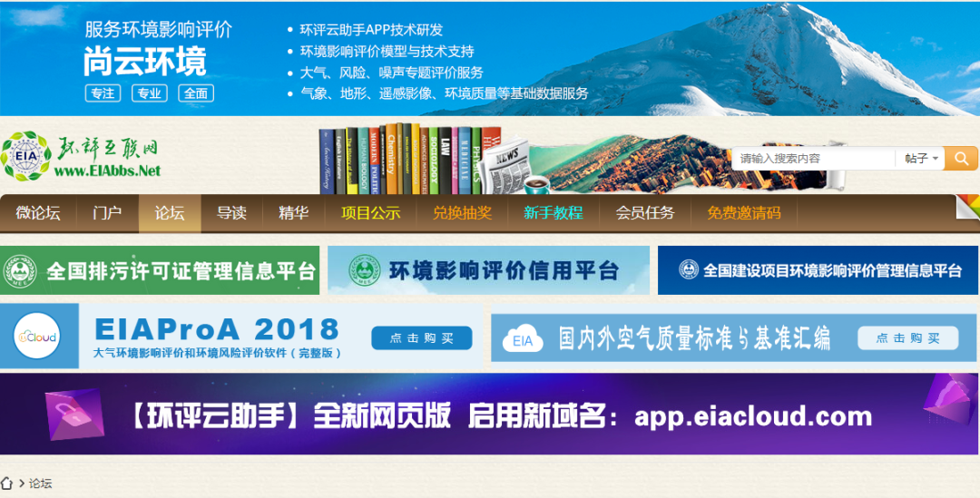 “环评云助手”APP开发于2017年,以“让环保变简单”为宗旨,一方面打造传统的行业数据库,集热点资讯速览、标准政策文件查询、基础数据服务为一体;一方面构建了新媒体业务模块,集成了视频直播、课程培训、云商城等功能版块。仅2020年环评云助手完成平台直播4次,累计直播访问量5万人次;上线系列培训课程50余节。目前云助手装机量已突破30万台,单平台下载量超过110万,遍及全国的注册行业用户超过10万。3、环评互联网论坛(http://www.eiabbs.net)环评互联网论坛是环境类专业信息最早期的传播与技术交流平台,也是目前为止依旧保持行业活跃度和影响力的环保专业论坛。论坛现拥有注册用户17.6万,日发帖量千余篇,一大批行业顶尖人才是与论坛共同成长起来的,他们长期在论坛中担任重要角色。早期论坛成员目前诸多多担任公司高管职位,或者自主创业成立了环保领域新型创业公司。1、团队力量