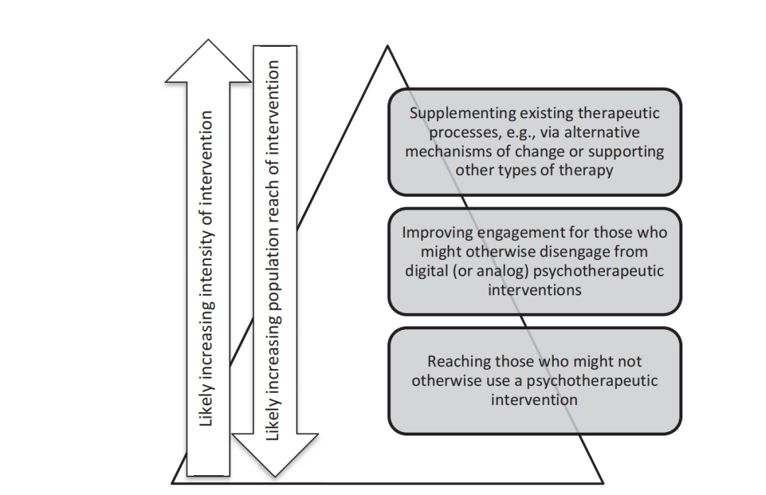 这些机会的不同方面有相当不同的目的。鉴于大多数有心理健康问题的人无法获得循证支持,增加的吸引力可能会对产生最大人群的影响。游戏在提高玩家参与度方面很有潜力,因为许多来访者在很早期就退出了治疗,特别是在线自助治疗。游戏在支持治疗性转变方面也具有重要的潜力,需进一步考虑。