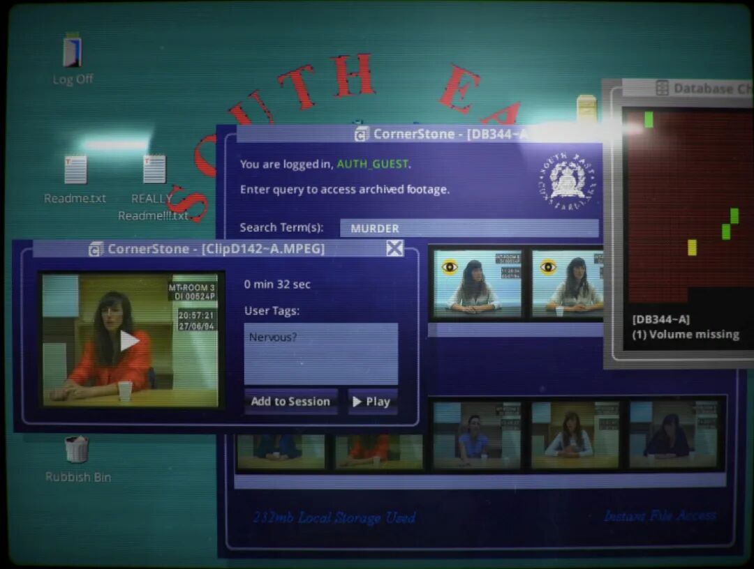《她的故事》(Her Story),在刑事调查中,你试图通过分析主要嫌疑人、受害者妻子的访谈视频来了解所发生的事情。