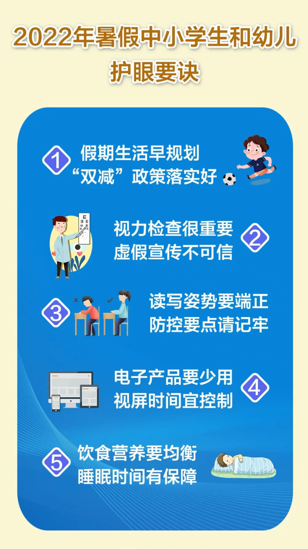 倡导家长在暑假主动带孩子到医院检查视力。引导孩子暑假居家期间经常通过标准对数视力表自检,早发现近视。经常关注孩子眼健康,有视物模糊、眯眼、皱眉、歪头等现象,及时到医院进行视力检查,建立视觉健康档案。发现近视不要慌张,不要轻信近视可治愈等虚假宣传广告,要尽早到医院就诊,科学矫治。