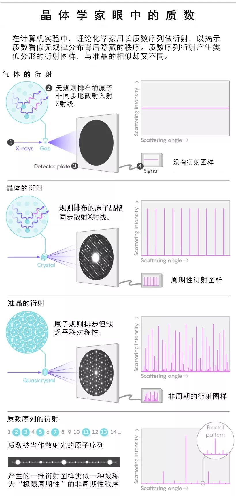 质数分布间隔的规律是什么?这是个至今仍未解决的问题。在本文介绍的研究中,晶体粒子以质数序列排布,在衍射实验中呈现出类似分形的结构,这为揭开质数之谜提带来来新的灵感。