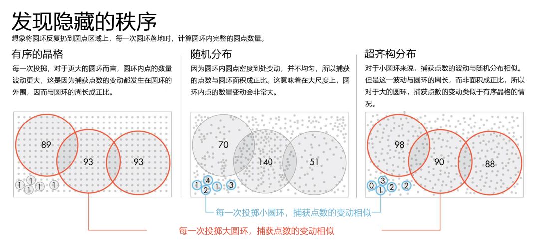 (1)首先,Torquato解释道,想象将圆环反复扔到有序的晶格上,每一次圆环落地时,计算圆环内的点数。圆环捕获的圆点数量从一次投掷到下一次投掷有所波动,但是波动并不大。这是因为圆环内部总是覆盖固定数量的圆点,捕获点数的唯一变化发生在圆环外围。如果增加圆环的尺寸,波动将会发生在更长的圆周上。因此,对于晶格分布,捕获的点数(或晶格中的“密度波动”)的波动与圆环周长成正比。(在更高维度,密度波动也与维数减去一成正比。)