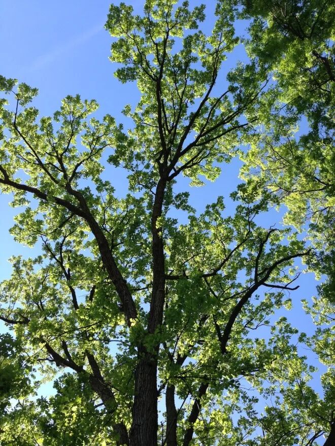 你可能认为你在看着一整棵树,但实际上,这是一幅向周围蔓延的树枝的图像。(我当时躺在树下,仰望着它,拍了这张照片。)树枝们看起来就像一颗小树,也就是我们想要捕捉到的“自相似性”。
