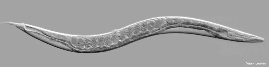 线虫的身体是透明的,当它像波浪一样运动时,它会闪现出不同的纹理色泽。光滑的卵在体内排成一排,肠子又黑又细。它长长的躯干上有灰色斑点,像月球表面一样黯淡无光。