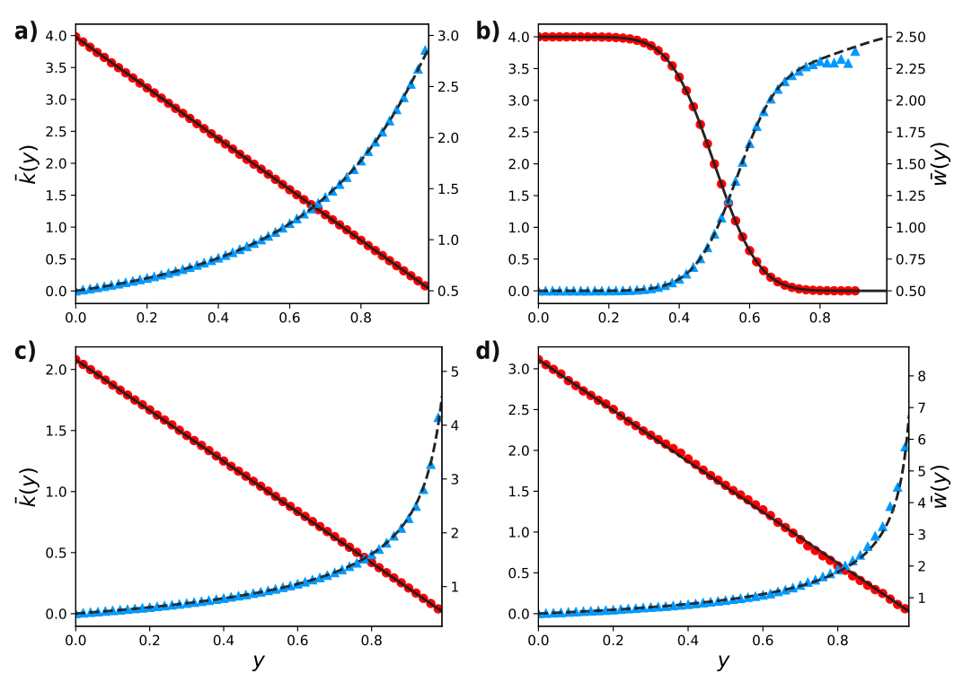 图2反映了上述的“扰动-响应”过程。子图a表示在扰动情况下,x2被移除后它的权重w2被平均分配到了另外两条边上,以保持网络的局部韧性。子图b上下两行反映了一般简单“过滤”与具有稳态响应的“过滤”的区别。网络下方的数轴表示随阈值y(红线)提升,部分边被移除后的边权分布(黑色)情况。可以看出,具有稳态响应机制的情况下,网络边权重总能保持在较为恒定的水平。研究者利用式1来量化逐步“瓦解”过程中的网络的度-权分布,如图3所示,该研究在一个节点数N=5×104、边权呈正态分布的大型随机正则图上记录无响应(第一行)、有响应(第二行)情况下的总权分布w(x)演化情况。在每个图中显示了随机模拟的经验权重分布(蓝色)和模型预测结果(橙色),垂直虚线代表阈值。预测与随机模拟结果验证表明,该研究提出的模型能准确预测复杂模式。从结构上看,整个网络的连通性由其中最大弱连通片(the largest weakly connected component)表征——巨片内部中的点相互连通,无关方向。研究者通过随不同阈值y下的度分布来量化对最大弱联通片规模Sw。结果表明,在存在稳态响应机制的情况下,最大弱联通片的“瓦解”被明显推迟。图3分别展示了在随机图和经验脑网络中,由于内稳态响应机制,渗透效应均被显著延迟。彩色标记表示蒙特卡罗模拟结果,分别考虑了20个连续的无响应的渗透过程(红圈)和有稳态响应的渗透过程(蓝色方块),黑色标记表示模型中每个y值的相应估计值。文章关于扰动对网络平均度和平均权重的量化进行了单独推导,在此不过多介绍。经验证,平均度和平均权重的分析预测与随机模拟之间具有良好的一致性。如图5所示,在四个不同结构的网络中红色标记为平均度,对应左侧坐标,蓝色标记为平均权重,对应右侧坐标。从图中可以看出,不同的网络结构极大地影响着变量之间的相关性。