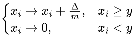 算子A为研究自适应退化现象提供了一个通用框架。现在来考虑“扰动-响应”机制的一个特定实例——前者由“过滤”表示,去除权重低于给定阈值y的所有边。后者则按照如下规则重新分配,m是满足边权重xi>y的边总数,