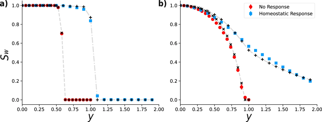 复杂网络最吸引人的特征之一是它能承受扰动和攻击。当网络的边具有相同性质时,可以借助渗流理论的数学框架来研究系统韧性。在渗流过程中边以一定的概率被删除,通过跟踪最大连通片(the largest connected component, LCC)的规模和这个概率的关系来研究网络的连通性。最大连通片的大小表明网络在受到扰动后的连接比例,在交通或者是通信网络中可象征系统效率。研究渗流有助于理解网络结构对其韧性的影响,已有大量的研究专注于最大连通片规模的一阶、二阶相变。优化边权的分配来获得更高的网络韧性是个老问题:在流行病学中这被称为“有针对性的免疫”,在电气工程领域设计高效电网,城市规划提升路网交通流量时均有运用。除此之外,一些生物复杂系统也会通过局部调节边权重来为网络整体效能带来积极影响。大脑网络和食物网络都被认为是通过一种自我调节机制来实现边权优化的,而这种机制是在受到扰动时才会触发。在这样的系统中,类似于“过滤”的过程伴随着主动响应以缓解由于删除网络边后带来的损失。例如神经元可以在扰动情况下,通过调整其突触强度以保障整体的神经活动。这篇文章给出了复杂网络中扰动响应过程的数学理论推导,该理论解释了如何保持节点的总入(出)权值局部守恒,反映了系统的全局连通性。研究通过“过滤”阶段的若干次迭代来对自适应网络退化建模,然后根据“稳态可塑性”原则(homeostatic plasticity principle)更新剩余边的权值,即每个节点的所有权值总和守恒。这一原理是受神经元中总突触强度守恒的启发。研究表明,这个能调整边权的简单、局部自我调节机制类似于神经元中突触的缩放,可以显著扩大网络的连通规模、维持网络效能,即使会损失一部分连边。图1. 稳态可塑性:当神经元的兴奋性处于持续改变状态时,神经元会主动启动程序化的分子和细胞反应,对突触功能进行调节以对抗神经活性的持续性改变,从而使得突触传递和神经兴奋性维持在相对稳定的水平,维持正常的神经功能。