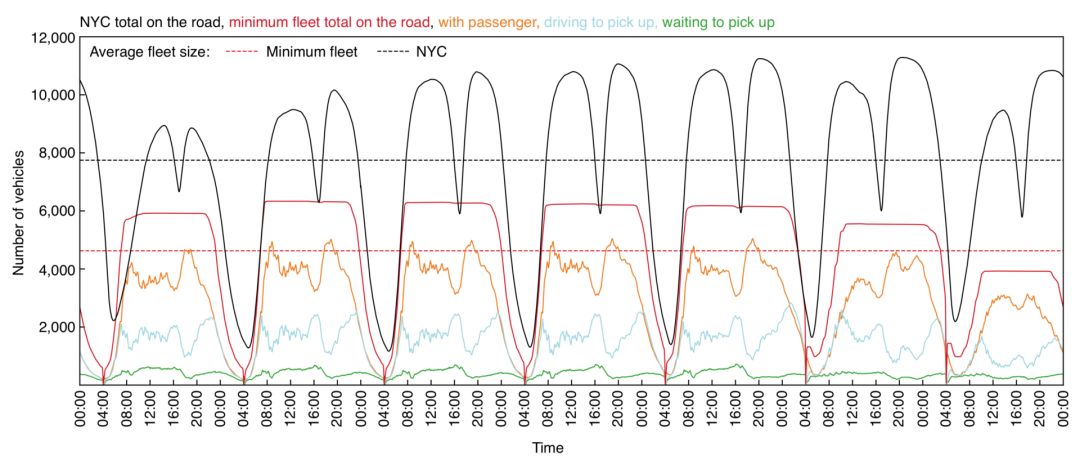其次,图5展示了实际出租车使用数量(黑色)、最优出租车使用数量(红色),以及处于不同模式的出行出租车数量(其它颜色)随时间的波动曲线。虚线对应的是它们的平均值。我们看到,如果使用算法来管理整个交通系统的话,我们每天平均仅需要实际出租车数量的60%就可以了,这足足减少了3000辆出租车的使用!