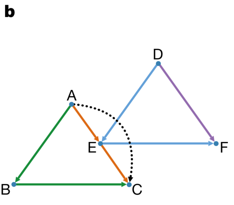 在图2这张网络中,一个节点就对应了图1的一个用户的出行需求,因此A就对应图1中T_A这条出行路径。而该图中的一条有向连边则对应了一种可能的任务切换,换句话说,如果节点A和B之间有连边就表示自动驾驶汽车有可能在完成了A任务之后再去完成B任务;如果没有链接,就表示自动驾驶汽车可能在完成了A任务之后由于时间间隔太长,或空间距离太远而不可能再去完成任务B。