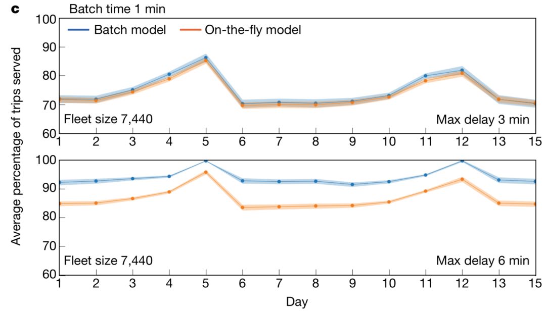 图6、7中的横坐标是时间,纵坐标是算法服务的出行百分比,这个百分比越高说明算法越好。我们看到,无论是从小时为单位衡量的出行还是以天为单位的出行,批模型的服务百分比更高。