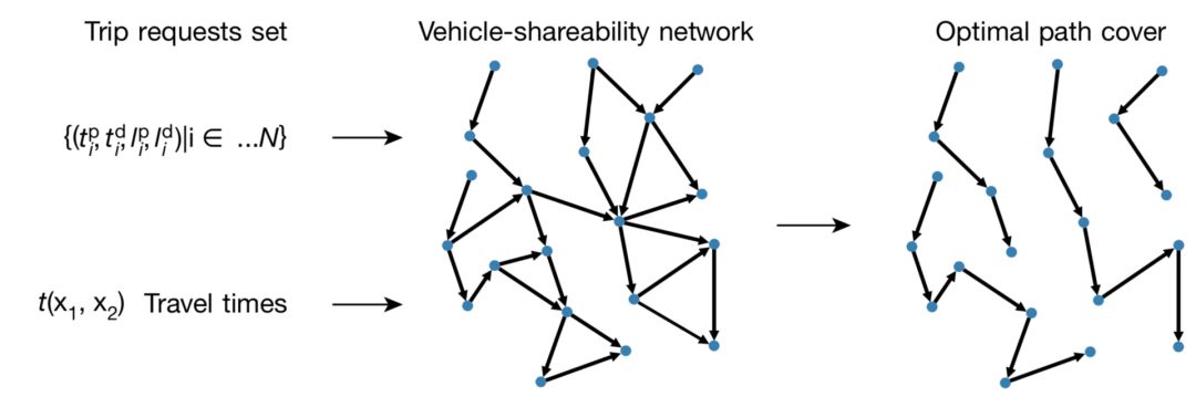 非常有趣的是,这一最少覆盖路径问题恰好就是前文叙述的最小车队问题。于是,利用车辆共享网络,我们巧妙地将最小车队问题转化为了共享网络上的最少路径覆盖问题。