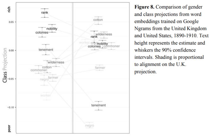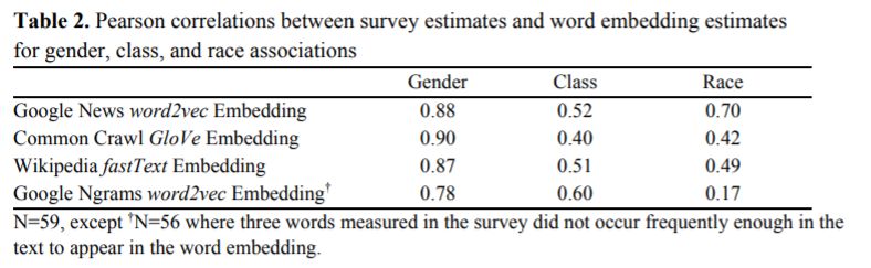 比较词嵌入模型得到的语义关系,和文化协会测量的调查数据,研究者们发现,词嵌入模型在文化社会学的描述上表现极佳。