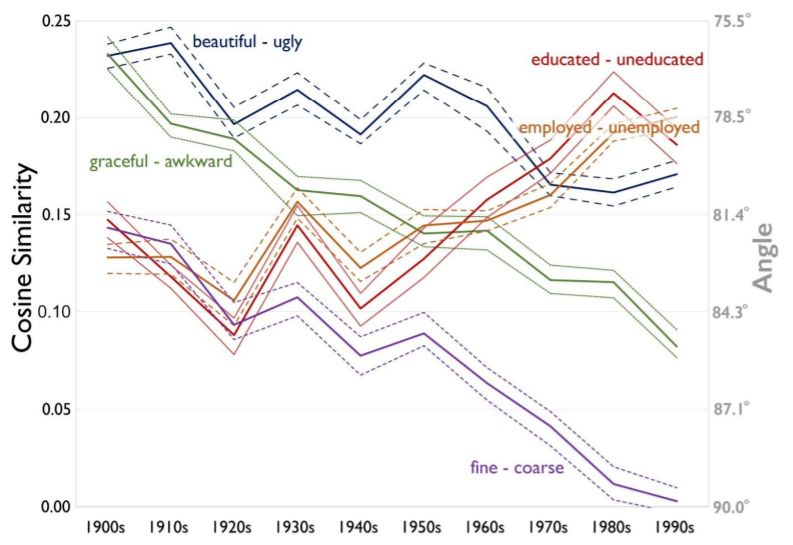 这项研究结果也表明,词嵌入模型在捕捉大数据文本中复杂的文化关系上,达到了之前方法无法企及的程度。
