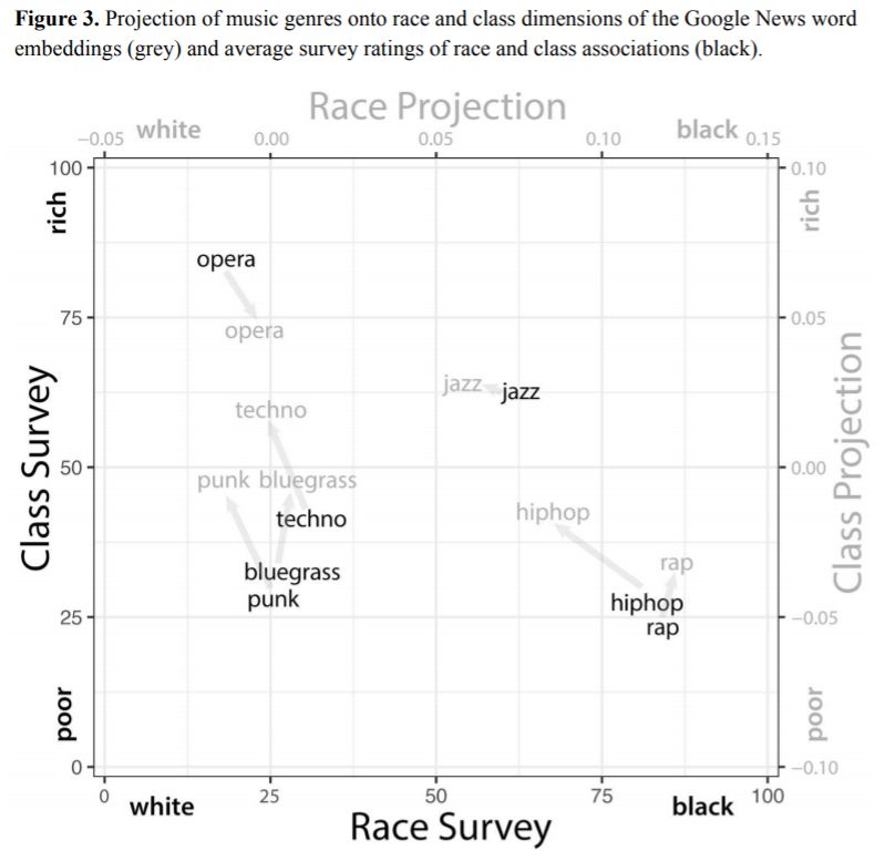 图1c | 爵士、说唱、歌剧、朋克、Techno、嘻哈、蓝草等几种音乐流派,在阶级和种族维度中的位置,黑色表示真实的调查情况,灰色表示词向量的投影。