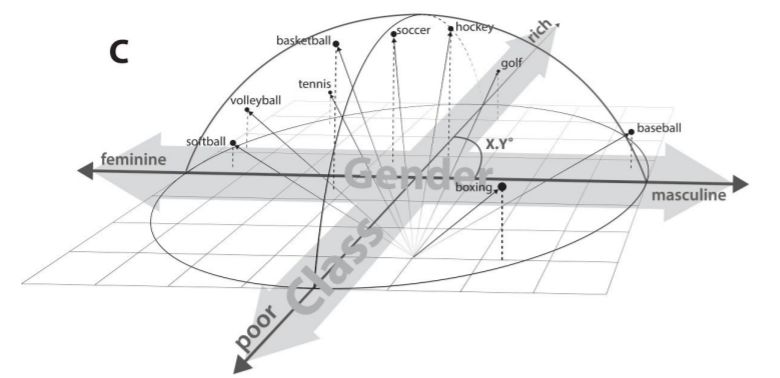 图2b(原论文图2c) | 体育运动领域词向量在阶级和性别两个维度中的表示。
