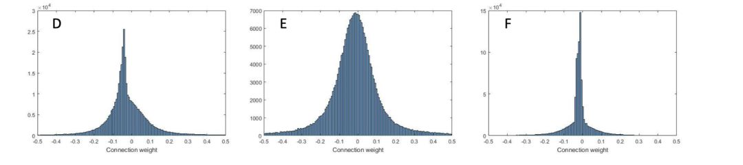神经网络初始化时各层权重都是根据高斯分布初始化,均值为0(图A),而经过学习之后,网络连边权重分布的均值向负数移动,由于偏度的增加,权重分布也不再是一个高斯分布。