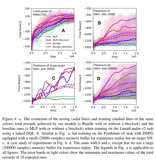 简单地来讲,文章把 MLP 和 Bundle 在两个经典的增强学习任务里进行了对比测试(LunarLander-v2的动作空间是离散的,Pendulum-v0 的动作空间是连续的)。前人的研究表明,为了达到较好的学习效果,我们有必要引入经验重演(experience replay);而对于动作空间是连续的情况,我们则更是需要引入一个缓慢更新的目标神经网络(target network)来保证训练稳定性。