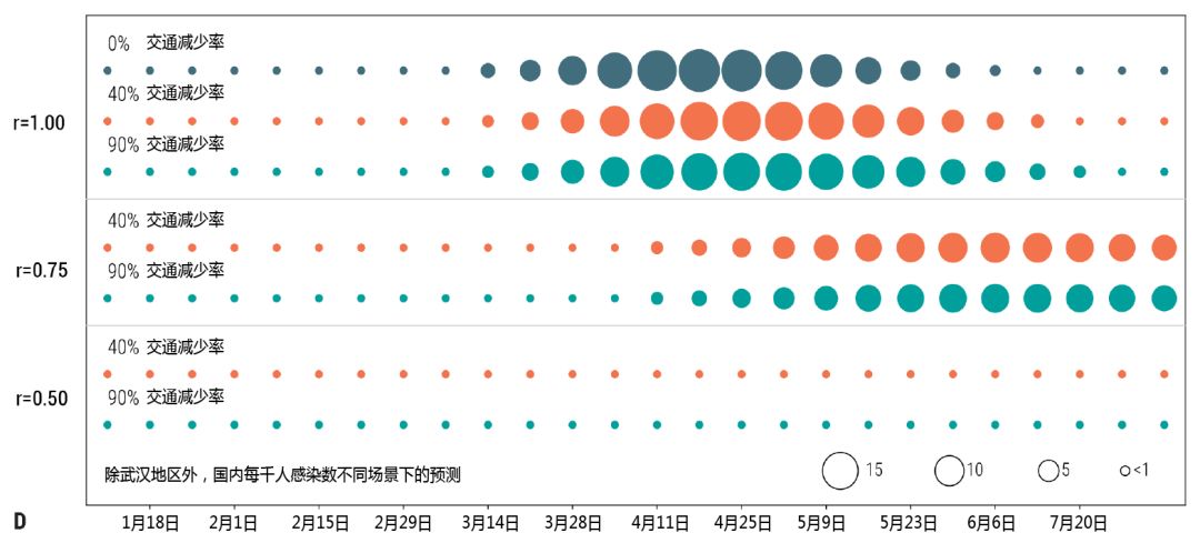 为了说明模型和真实情况的相似性,将各省的实际病例数和模型预测的结果进行了对比,并进行了线性回归,计算了皮尔森相关系数结果表明模型预测和真实情况高达0.74,p值小于0.0001,图中横轴是真实病例,纵轴是模型模拟的病例数,每个圆圈代表了一个省,圆圈大小程度代表了该省的人口规模大小。该图对科研人员的启发在于散点图中,能通过圆圈大小或颜色来代表该点自身的属性。对于模型可靠性的另一个测试是观察在国外检出的病例中,有多少来自武汉,纵轴为平均病例数。下图中蓝线代表不采取任何措施,红线代表武汉封城,国内交通减少90%且基本再生系数不变;绿线代表红线条件下,国内的基本再生系数变为初始值的0.5,由于输出到国外的病例较少,随机波动影响较大,因此图中的阴影代表了99%的情况。图中三条线的对比,指出仅仅降低交通,不改变基本再生系数,平均病例会由于潜伏期出现波动性的增长。黑点代表实际情况,从黑点所处的位置来看,更适合的场景是绿线代表的那条。