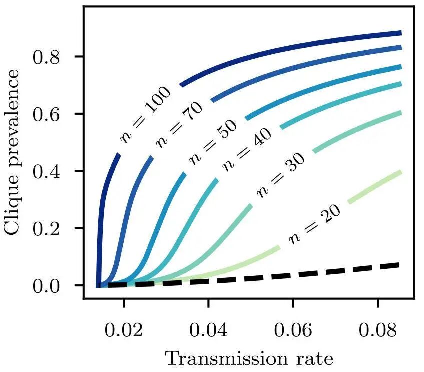 如图7所示,展示了在人数为n的聚集性活动形成的小集团内部,集团内疾病流行程度(纵坐标)与病毒传播能力(横坐标)的关系。其中虚线表示在所有疫情爆发地区的平均疾病流行程度。从图中可以看出,即使病毒的传播能力非常有限,但在大型聚集性活动中疾病一旦开始传播,就会迅速蔓延,至少会导致集团内部半数的人被感染,并且疾病流行程度会随着聚集性活动规模的增加而超线性增长。文章进一步论证了取消大型聚集性活动对于疫情防控工作的重要意义。本文围绕疫情防控工作中的防控政策与防控措施展开,文章通过建立一个符合真实数据同时可以量化社区防控与出行限制政策的空间模型,发现仅需要群体中有40%- 60%遵守政策,社区防控政策对于疫情防治就会产生明显的效果。同时,出行限制政策可以有效降低群体中因遵守政策的人员比例不足造成的疾病传播风险。两个政策相互配合可以快速高效的展开疫情防治工作,避免疾病扩散与医疗资源浪费。此外,另一篇文章,基于个体间的接触结构建立了疾病传播模型,强调了取消大型聚集性活动对于疫情防控的重要意义。