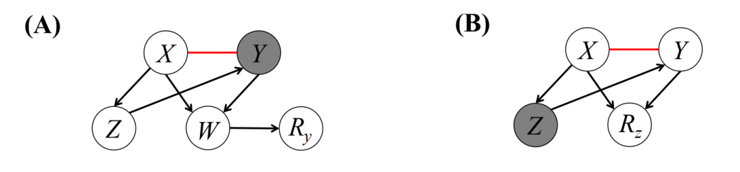该数据丢失机制可以通过以下的因果图(missingness graph)[1]表示。图中的代理变量Y*(proxy variable)表示观测到的含有丢失数据的Y变量。由于Y,Ry和Y*的关系可以唯一确定,所以后文因果图中将不画出Y*。