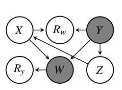 例如上图的代码中,Ry是数据缺失指示变量 (missingness indicator),它代表了变量Y的数据中是否包含丢失数据。同时,因为Ry的数值由变量W决定,所以变量W被称为是缺失指示变量Ry的直接原因(direct cause)。