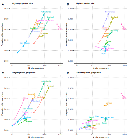 引用精英中的作者越来越多地来自西欧和澳大利亚,而美国已经降低了其顶级被引用科学家的所占比例。这表明全球科学中的权力关系正在发生变化。