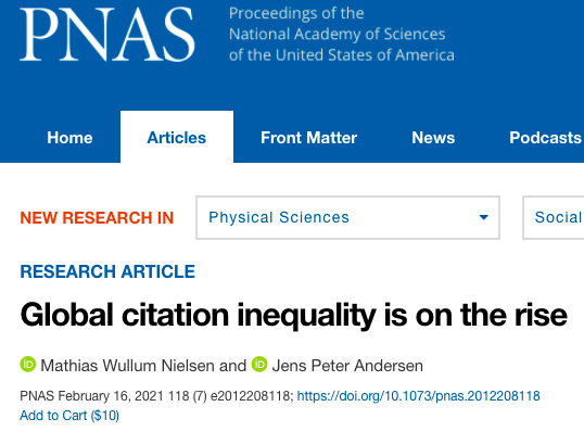 这项研究显示,过去二十年来,一小部分被引用最多的前1%的作者(即“引用精英”,citation elite)的引文集中度有所增加。科研马太效应愈发强烈。