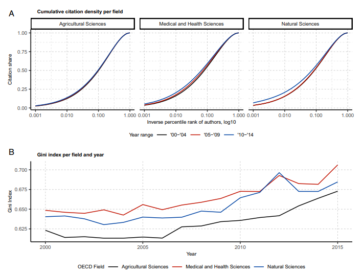 在经济合作与发展组织(经合组织)的三个主要领域,引文不平等且集中在少数人手中的现在愈发严重。同时,在2000-2004 年和 2011-2015 年这两个时期,58%的农业科学子领域、58%的医学兼健康科学子领域以及27%的自然科学子领域中,与总体引用数的增长频率相比,每个学科被引用最多的前 1%论文的被引次数甚至十倍于本领域的总体增长率。