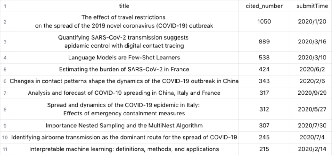 可以看到,disruption指标呈现明显的钟型分布,大部分值集中在0附近,即使去除掉了没有引用记录的论文也仍然如此,分值大于0.1或小于-0.1的论文仅占所有论文总数的约4%。这一分布与原论文中的分布也基本吻合。也就是说,大多数论文的创新性都不是很高,这也许是因为巨人的肩膀太高而另辟蹊径又太难......进一步分析,对于不同类型的论文,其disruption指标反映了哪些特征呢?这里我们举一类例子——综述论文,综述论文的任务是要概览当前领域已经发表的有影响力的工作、分析其发展情况,给该领域的其他研究者作为参考。因此,综述论文要大量引用其他论文,并且是有影响力的论文,这使得在计算 disruption 时,分母nI+nJ+nK比一般的论文更大,因而综述论文的 disruption 值一般会较小。而前文我们使用disruption 指标评选的第一名却是一篇综述,可见该综述对之前研究的整合很成功,通过整合和梳理引起了其他研究者的广泛关注。如果我们单纯根据引用量给论文排名会怎样呢?作为比较,这里列出斑图2020年收录的论文按引用量排名的前10位(即高引用论文)。表2 按citation排序得到的 top10 论文
