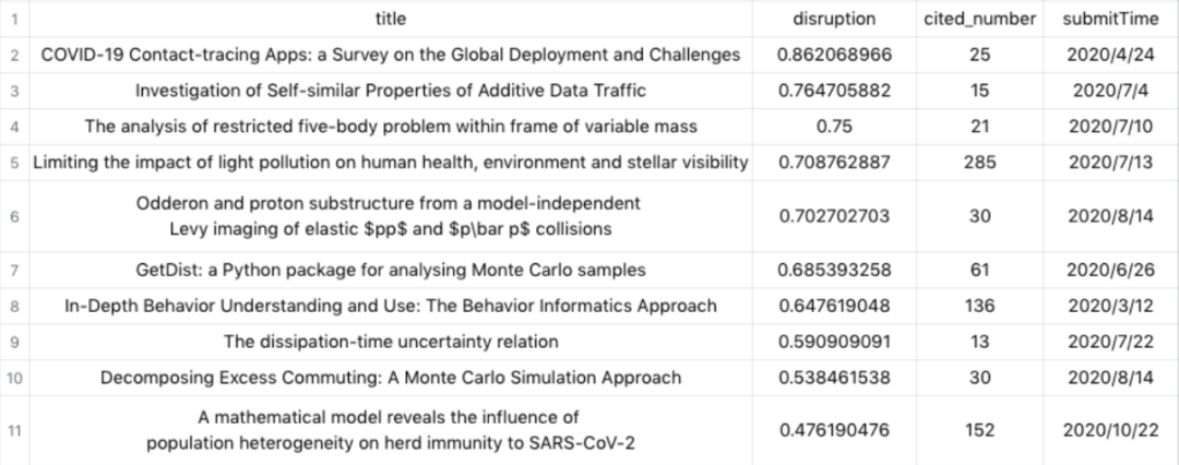 我们发现按引用量排名,靠前的大部分是关于疫情和机器学习的研究,几乎没有出现其他学科。这两个领域是当前的热门领域,但如果想要尽可能全面地了解复杂科学的研究全貌,那么引用指标就会遮盖很多子领域的重要研究。综上,我们目前采用disruption指标来对复杂科学论文的创新性排序,并据此获取概览复杂科学的一种视角。当然,由于斑图仍处于不断开发完善中,2020年可能还有一些潜在的复杂科学研究没有被收录和进入排序结果,也由于使用disruption指标可能还有更多工程因素需要考虑,我们目前的论文创新性排序仅供读者参考,集智算法组欢迎读者朋友们讨论和提出更好的论文影响力评价方案。