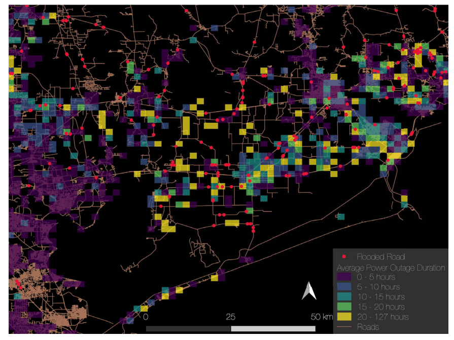 当一次大型扰动引发多处故障时,维修时间也会受到资源限制的影响,例如维修人员和卡车数量有限。当然,资源限制会对整个服务区域产生相同影响。如果支持网络设施受损的地区恢复过程延迟,那么恢复耦合是维持系统运行的主要驱动因素。为了区分资源限制和恢复耦合这两种机制,该文章对同时影响电网及其支持网络的自然灾害进行研究。图6. 热带飓风伊梅尔达期间被淹没道路的平均停运时间和位置。延迟修复主要发生在博蒙特和休斯顿东北部,该区域受洪水影响最严重。
