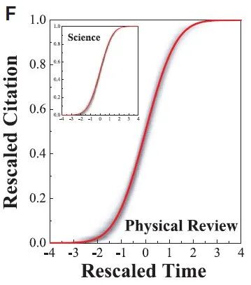首先,相对于引用数量,引用模式或许可以给我们更多的信息。关于引用模式一个著名的结果是,不同学科的论文,其引用量分布(被引用一定次数的文章占学科内所有文章的比重)经过合适的缩放(rescaling)后服从统一的规律[5]。那么对单篇论文而言,其引用量有无演化规律可循,使我们能根据引用历史预测长期影响呢?