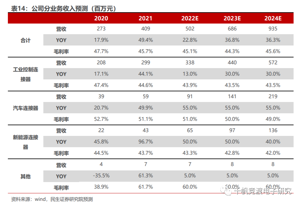 新能源连接器:新能源下游行业景气度较高,且公司通过昆山子公司积极扩充生产产能及自动化水平,我们预测2022-2024年新能源连接器领域板块收入同比增长50.0/50.0/40.0%。毛利率方面,新能源连接器早期业务体量较小,毛利率波动较大,未来预计趋于稳定,我们预测2022-2024年毛利率为43.3%/42.8%/42.0%。