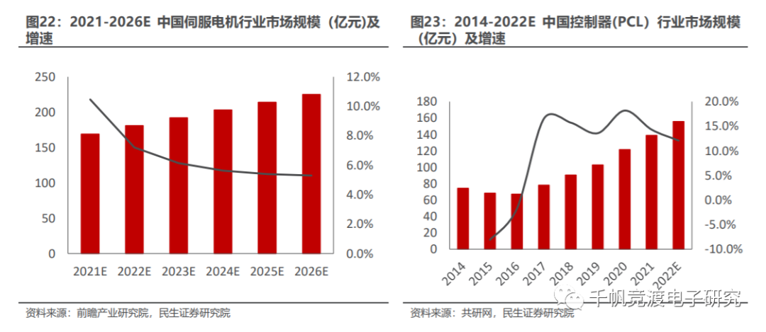 工业自动化下游硬件强劲增长,连接器需求较大。1)伺服电机:产品在新兴产业应用广泛,增长迅速。据前瞻研究院数据,2022年我国伺服电机行业市场规模约为181亿元,2022年-2026年复合增速达5.6%。2)控制器:根据共研网数据,2021年PCL行业市场规模为138.9亿元,同比增速为14.3%,下游行业投资规模的增长将进一步带动伺服电机和控制器需求增长。3)工业计算机:呈现明显增长的趋势,根据IHS数据统计,2019年全球工业计算机市场规模约41.2亿美元,由于物联网在制造业中广泛的应用,使得工业计算机需求增长迅速,预计2022年全球规模为49亿美元,2019-2025年年均复合增长率为4.4%。