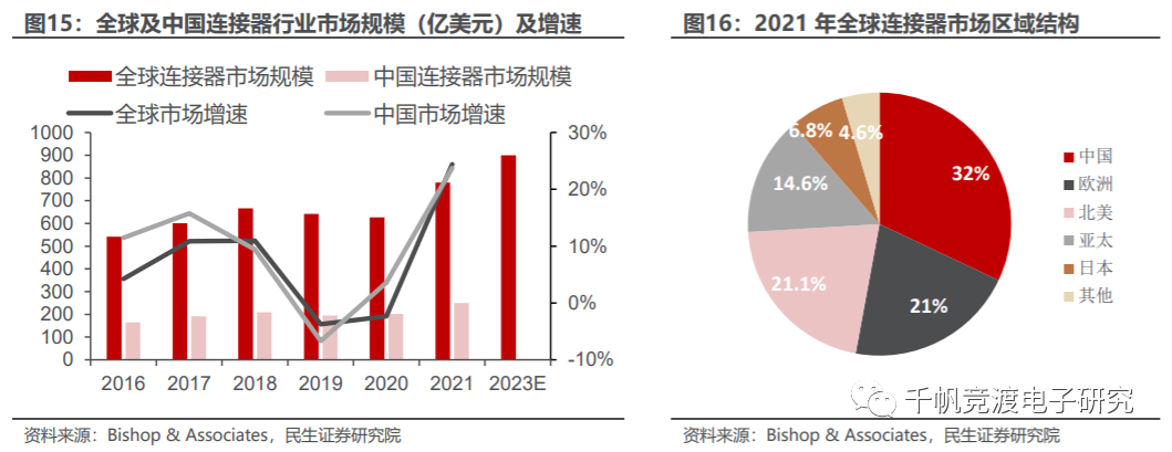 全球连接器市场主要分布在中国、北美、欧洲、日本、亚太(不含日本和中国)五大区域,2021年上述总计占90%以上份额。近年来,中国等新兴市场呈现强于全球平均水平的增长态势,成为推动连接器行业市场的主要增量。具体来看,2021年国内市场规模达到250亿美元,同比增长24%,占据全球市场的32%。