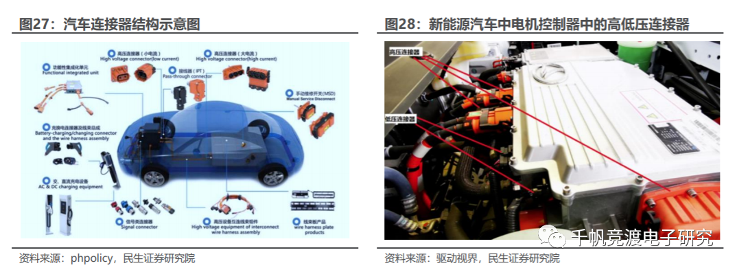 汽车连接器广泛应用于动力系统、车身系统、信息控制系统、安全系统、车载设备等方面,按性能划分可分为传输交换电流电连接器和传输交换数据信号高速连接器,根据工作电压的不同,电连接器又可分为低压连接器和高压连接器。其中新能源汽车的电动化对应低压/高压连接器,而智能化变革推动了高速连接器的发展。新能源车高压连接器指的是高于48V的电连接器,主要应用于新能源汽车上的高电压大电流电路中。具体的应用场景包括:DC-DC转换器、PTC器件、直流充电口、高压箱、电动空调等。