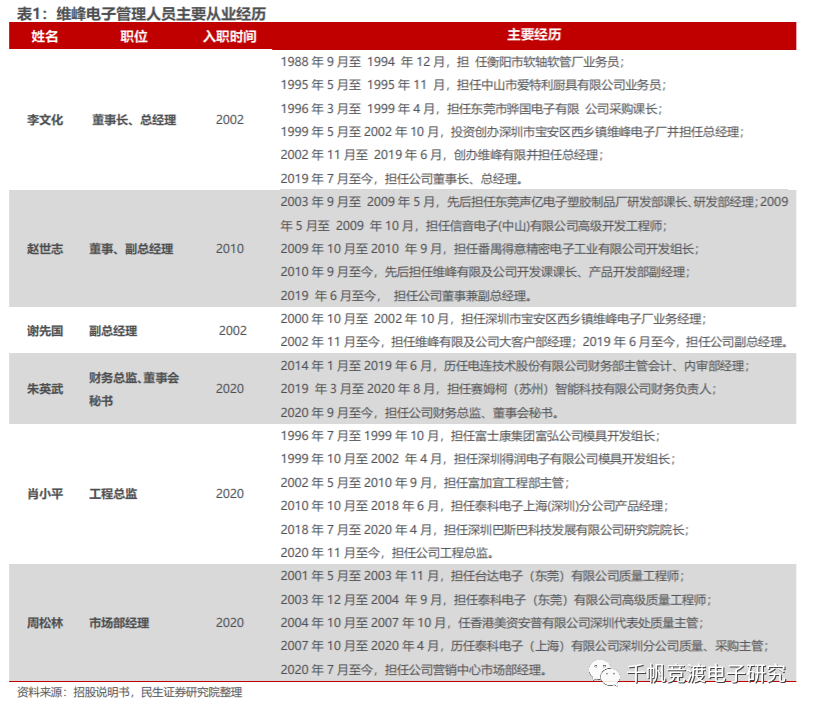 公司管理团队工作经验丰富。总经理与两位副总经理入职时间早,核心管理人员较为稳定;同时,公司工程总监、市场部经理等高管人员曾在泰科、得润电子等企业就职,工作经验和管理经验丰富,有利于帮助公司借鉴龙头企业的管理和运营经验,促进公司长期发展。