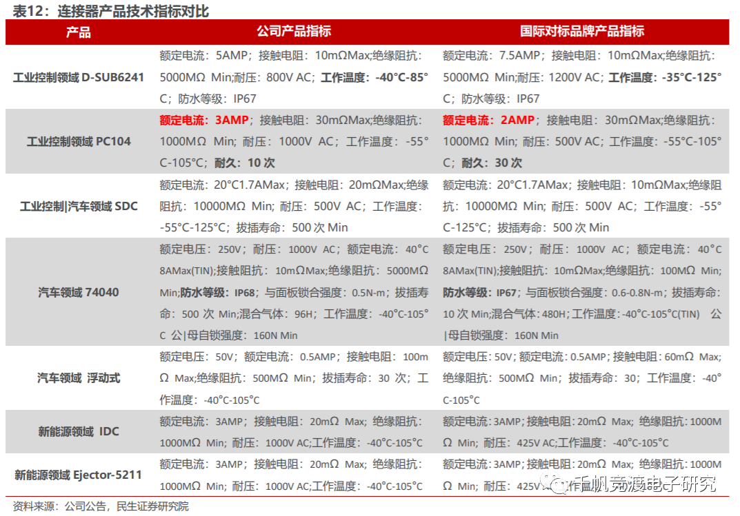 本土厂商加速发展,竞争力不断增强。相对于国外龙头,本土厂商起点相对较低,但得益于中国下游新能源汽车、电子制造等行业快速发展,国家政策支持,本土企业贴近客户、反应迅速灵活等优势,国内连接器企业本土市占率逐步上升,在部分领域已经具备与国际领先企业抗衡的能力。国内企业主要在新能源汽车、消费电子等领域取得突破。在新能源车领域,国内外处于同一起跑线,不存在较大技术差异。在消费电子领域,国内厂商凭借产业集群效应,规模化生产标准化产品,形成良好的成本管控,取得一定突破。但是,国内企业在技术壁垒、附加值较高的工业、特种等领域的产品研发和制造方面不占优势,国际企业仍然占据相关高地。